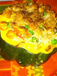 I was originally introduced to acorn squash by my Mother in Law. She put it in the oven with a little butter and brown sugar. Having been raised by a Mom that was not a fan of squashes it was a very new flavor to me and I fell in love with the first bite. On the other hand my husband grew up with it and doesn’t find it as exciting. With this dish I decided to dress up my Mother in Laws recipe a little but not loose the sweet flavor. I thought a Biryani style rice would go well and created my own spin to this Indian rice dish. The Fried onion pieces were added to the top because my six year old will try anything that they are on top of, though I definitely think the dish would be fine without this addition.