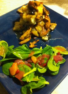 Place a stuffing patty on the plate. Top with chicken-less strips, mashed potatoes, and gravy. Garnish plate with baby spinach leaves covered in pomegranate clementine glaze.