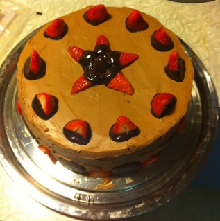 Melt chocolate chips over low heat. Mix in almond milk, syrup and cinnamon. Place first layer of cake on serving platter/plate. Use half of filling covering first layer of cake. Keep filling 1/4″ away from cakes edge. Arrange 1/2 of the sliced strawberries over chocolate. Place second layer of cake on top and do the same thing. Put the last layer on top and ice (icing recipe below.) As for decorating…I apologize because I didn’t write down how much chocolate I used to dip the strawberries in. I cut the strawberries in half, dipped them half way into melted chocolate and place on the cake. The possibilities are endless. Have fun!