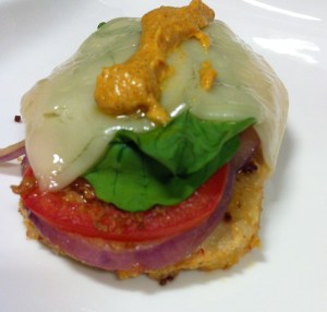 So today I was having random thoughts of Cordon Bleu and Club Sandwiches so I decided to mix the two worlds. The initial plan was to butterfly cut the fillets so I could stuff them but they are entirely too thin and broke apart. As usual with failed creations I quickly modified and decided to stack the ingredients instead. Even the vegan kid liked it (minus the onion and cooked tomato) which was the perfect Valentine’s gift for Mommy. Extra bonus-Super easy! From start to finish approximately 30 minutes, and that is counting the time where I was trying to figure out what I was doing.1 7 oz pack Gardein chick n’ fillets