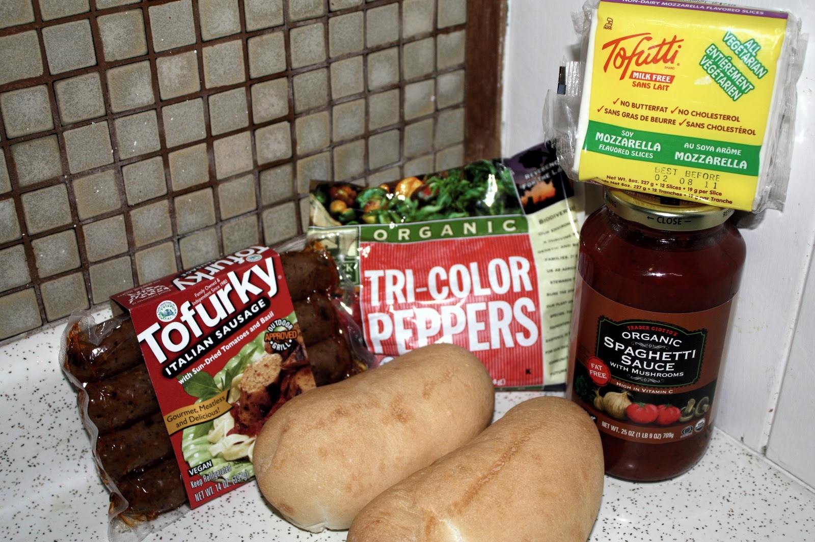 Preheat broiler while heating sausages, peppers and tomato sauce in a skillet. When warm, layer sausages, peppers and sauce into a split hogie roll. Cover sausage/peppers with Tofutti slices, broil until the ‘cheese’ has melted.