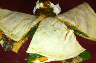 Mix together miso, tomato paste, lemon juice, nutritional yeast, and tamari. In small pan melt butter on low heat. Once melted slowly whisk in flour until it becomes a paste. Add in miso mix. Stir in cream cheese until completely mixed. Cover one side of a tortilla with spread. Add other ingredients over the top of spread. Fold tortilla in half. Bake for 10 minutes and serve. You can also lie a tortilla with ingredients on it in a skillet of melted Earth Balance until golden, fold onto a plate and serve.