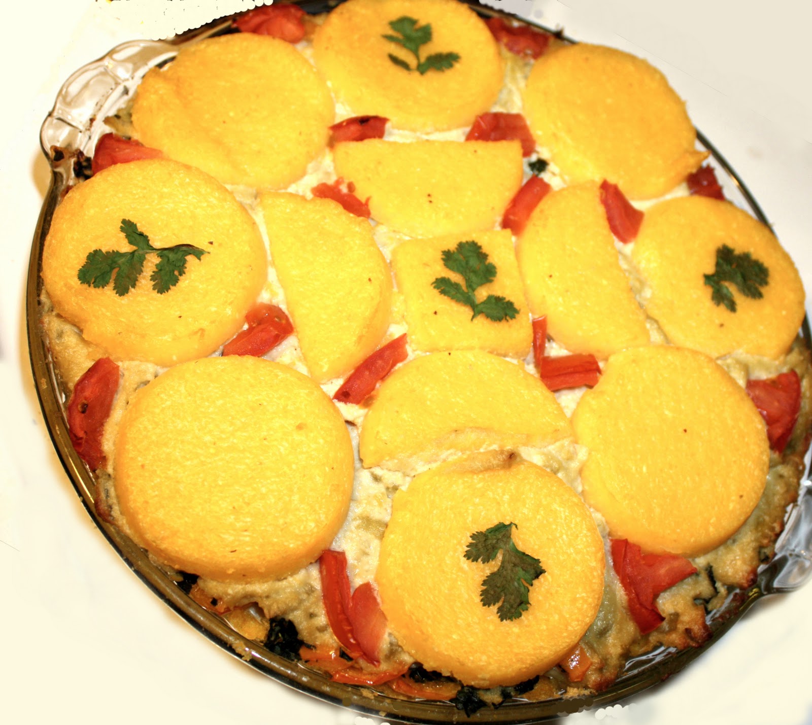 Once Polenta pie has baked for 30 minutes spread the mashed sweet potatoes over the top.