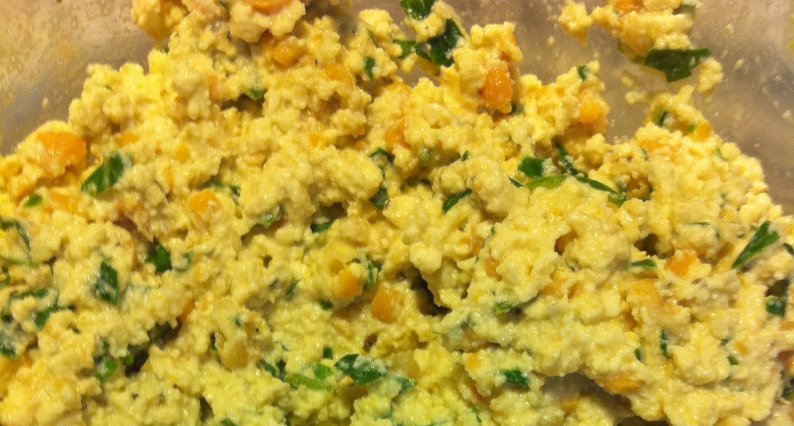 Place tofu and garbanzo beans in a bowl and mash with a fork until the consistency of ricotta. Stir in remaining ingredients. Let while preparing the rest of the ingredients.