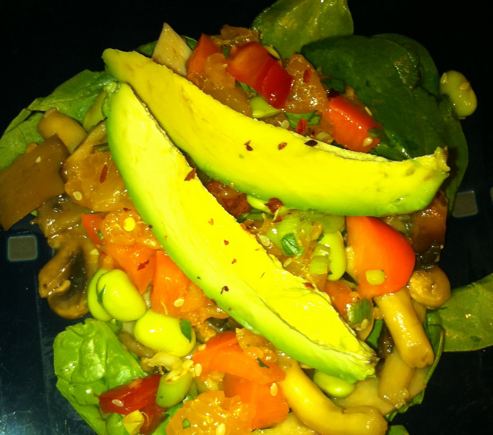 At a Japanese restaurant we had ordered a mushroom spinach saute that had a sweet sesame sauce which inspired this dish, that and the gourmet mushroom medley that I needed to use. Not sure how I came up with the relish but it worked. I served it over a bed of spinach . After tasting the relish I thought it would have gone great with diced avocado if only I wasn’t allergic to them, so for everyone else I served the diced avocado on top. If you like avocado it would go great in the relish! Serve as a meal for two or a side salad for four.