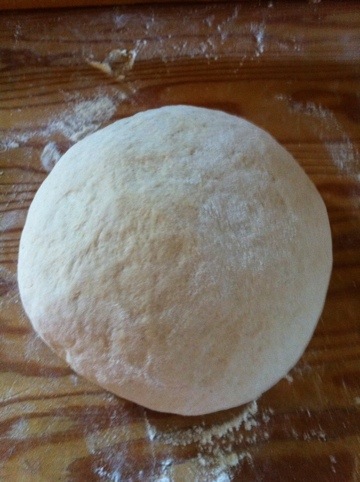 Flour a board and put dough on it. Knead dough by hand for about 5 minutes making sure hands are well floured so it doesn’t stick. If dough begins feeling sticky you may shock it by slamming it against the board. Work dough into a ball.