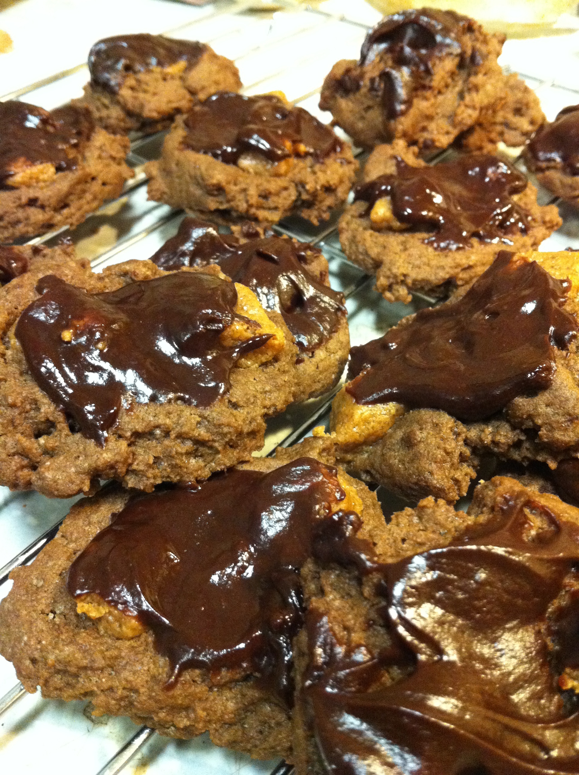 To make icing melt chocolate chips with almond milk in a sauce pan over low heat. Once melted completely stir in peanut butter. My original plan was to use to use a pastry bag and drizzle the chocolate over the cookies all pretty like but reality sunk and I came to terms with the fact that I was not Superwoman. It was midnight and I needed to be up at 5:30 the next morning so I simply flipped the cookies over and dunked them in the chocolate running out of chocolate 1/2 way through. If you opt to use my lazy girl but tasty method you will probably want to double the icing recipe. If you are going to be all crafty and pretty the above measurements are perfect.