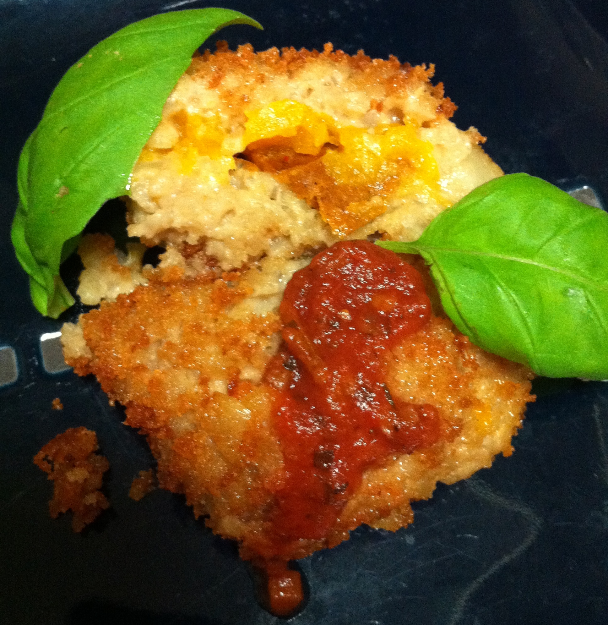 Some notes about my experiment. You need at least 24 hours for this dish because you want the risotto to sit overnight. The risotto came out amazing and my husband is already asking when I will make it again. The cheesy mashed potatoes gave it an amazing creamy texture. I made my balls too big (yes, that was hard to type with a straight face.) The butternut squash and pepperoni mixture use for the stuffing was pretty tasty. Most importantly, my Italian hubby loved them!