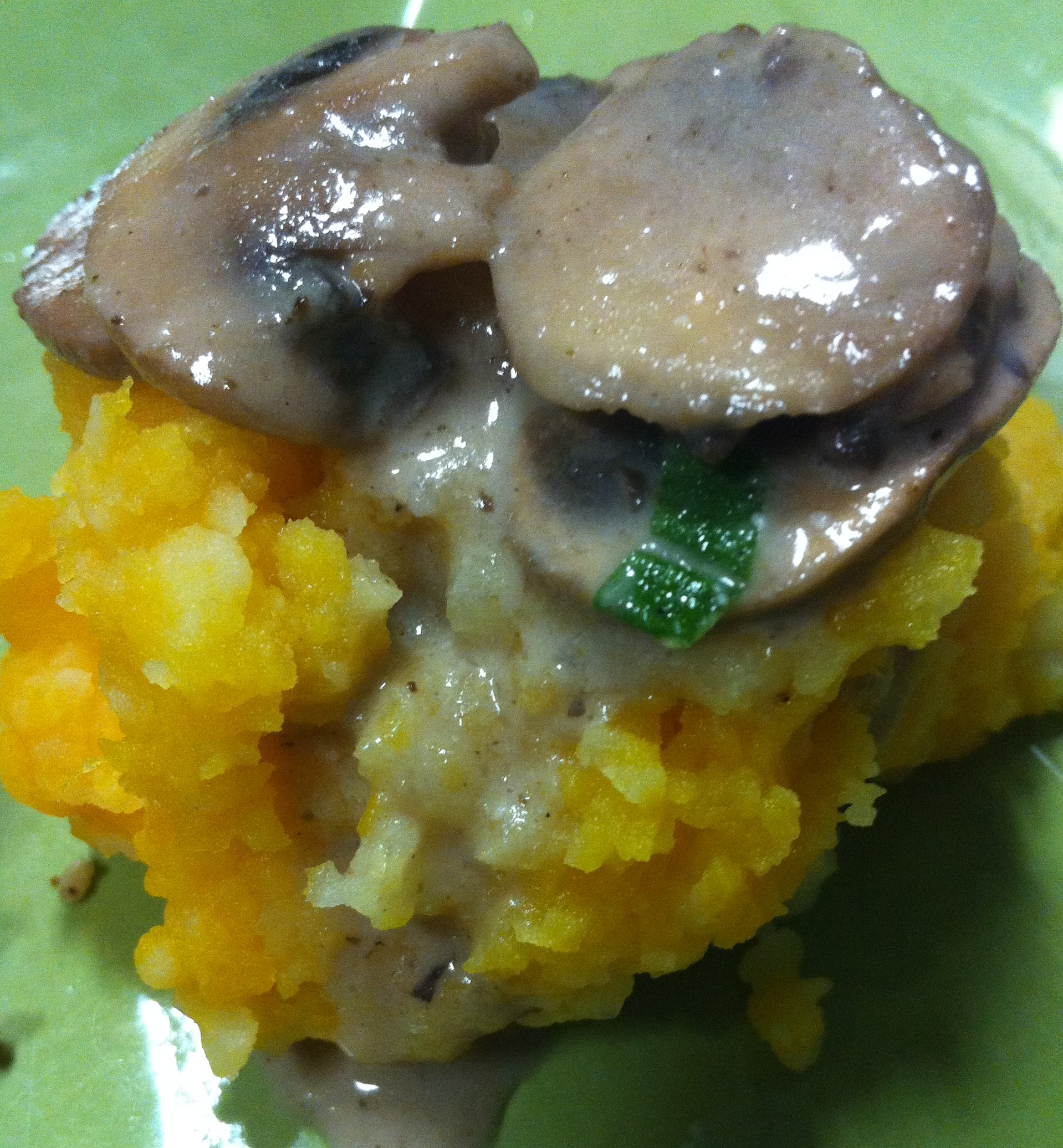 Make butternut squash and potatoes separately by boiling until soft enough to mash. Then either mash each separately or put in food processor separately. Add nutmeg, butter and nutritional yeast to potatoes. Fold squash into potatoes but don’t blend completely so that there is still a separation of squash and potatoes. Recommend serving with Mushroom Sage Gravy.