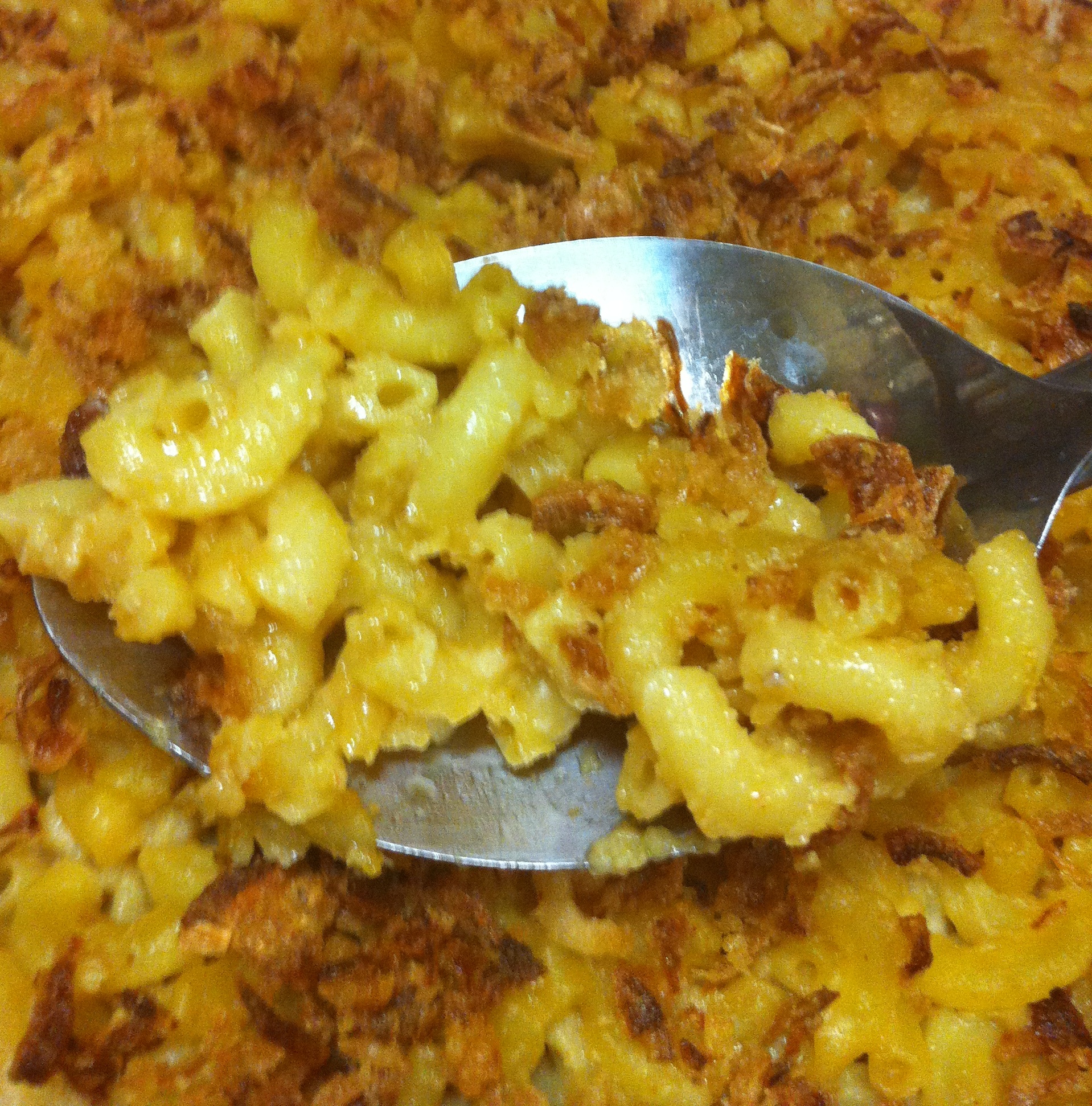 Add cooked macaroni to potato mixture then put in a casserole dish. Sprinkle fried onion pieces over it. Bake for 25 minutes or until brown on top. Serve and enjoy!