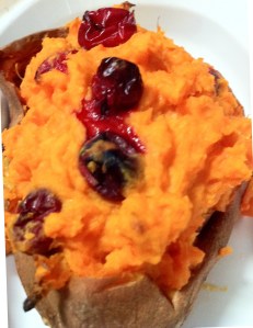 Add cream cheese and butter and with a potato masher mash until well blended. Gently fold in cranberries. Stuff mixture into each potato skin so that they are over stuffed. top each potato with two/three cranberries. Bake potatoes for 30 minutes. Let cool for a few minutes before serving.
