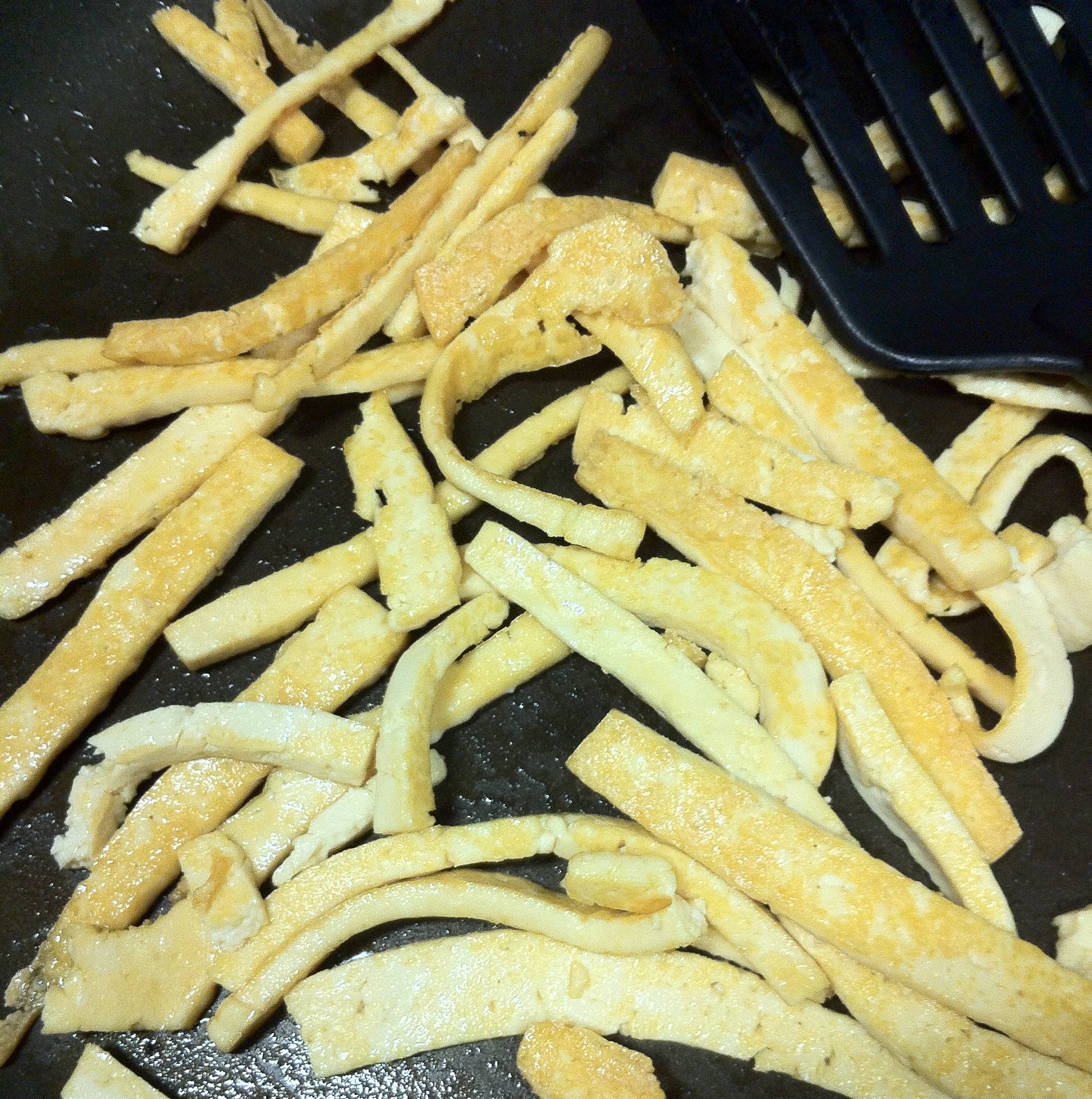 Slice pressed tofu in thin strips. In a large skillet heat 1 tbsp oil and fry tofu on medium heat until golden brown. Turn heat to medium/low and sprinkle nutritional yeast over tofu, stirring so it is well covered. In a small cup mix ingredients from liquid smoke to tamari. Pour liquid smoke ingredients over tofu and cook for five more minutes. Remove tofu from pan and set aside. Do not clean out pan.