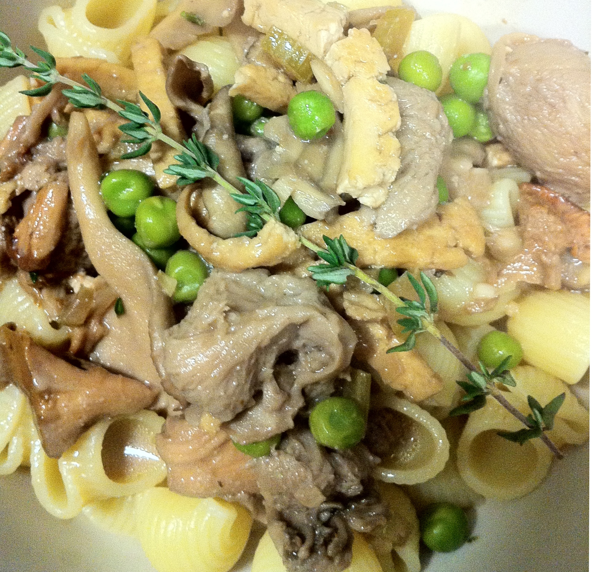 When the twenty minutes are up stir in cashew cream and leaves off the second sprig of thyme. Simmer for five more minutes. Serve over pasta.