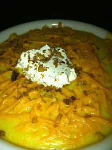 This is one of those days I thought a microwave might have been nice to bake the potatoes in, but I survived! Aside from the time involved the soup is pretty basic and the final product is rich and decadent. This a perfect dish for those vegetarian friends that say they could never give up cheese. It’s proof that they don’t have to give up the flavor!