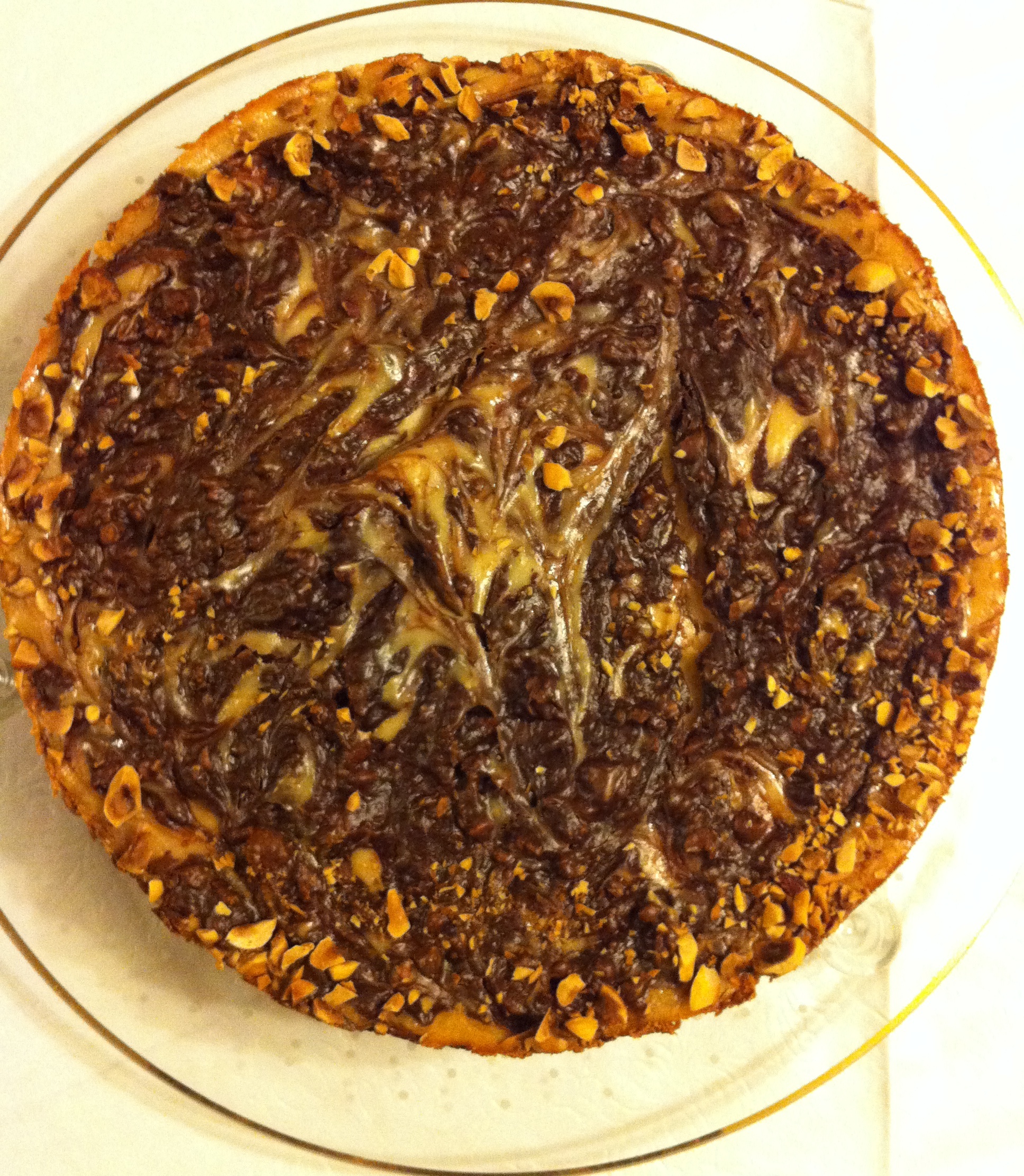 Pour cream cheese mixture (reserve 1/2 cup) over crumbs in pan. Add reserved cream cheese mixture to chocolate mix. Cover top of cheesecake with chocolate mixture. With a skewer stick it in the cake and move it around to create swirl effect. Be careful to not scrape the bottom. Sprinkle top edges with the 2 tbsp hazelnuts. Bake for 75 minutes.