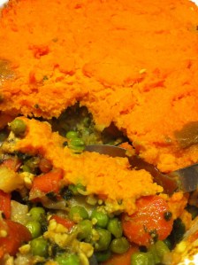 In a casserole dish ( I used a 14″ x 8″ oval, the original recipe used a 9″ round, I wanted the potatoes to be thinner on top) cover the bottom with the tempeh mixture, then spread sweet potatoes over the top. Bake for 45 minutes.