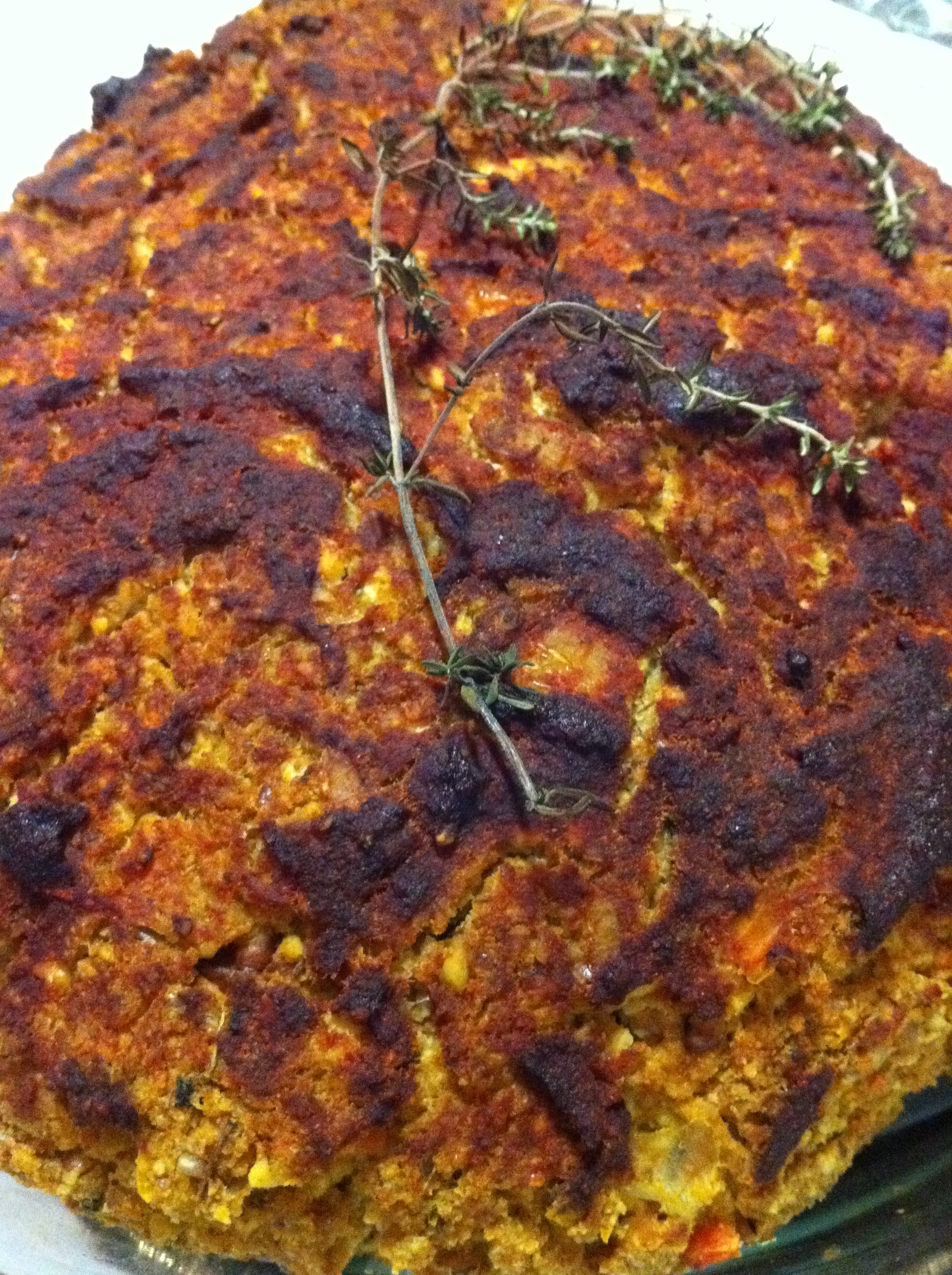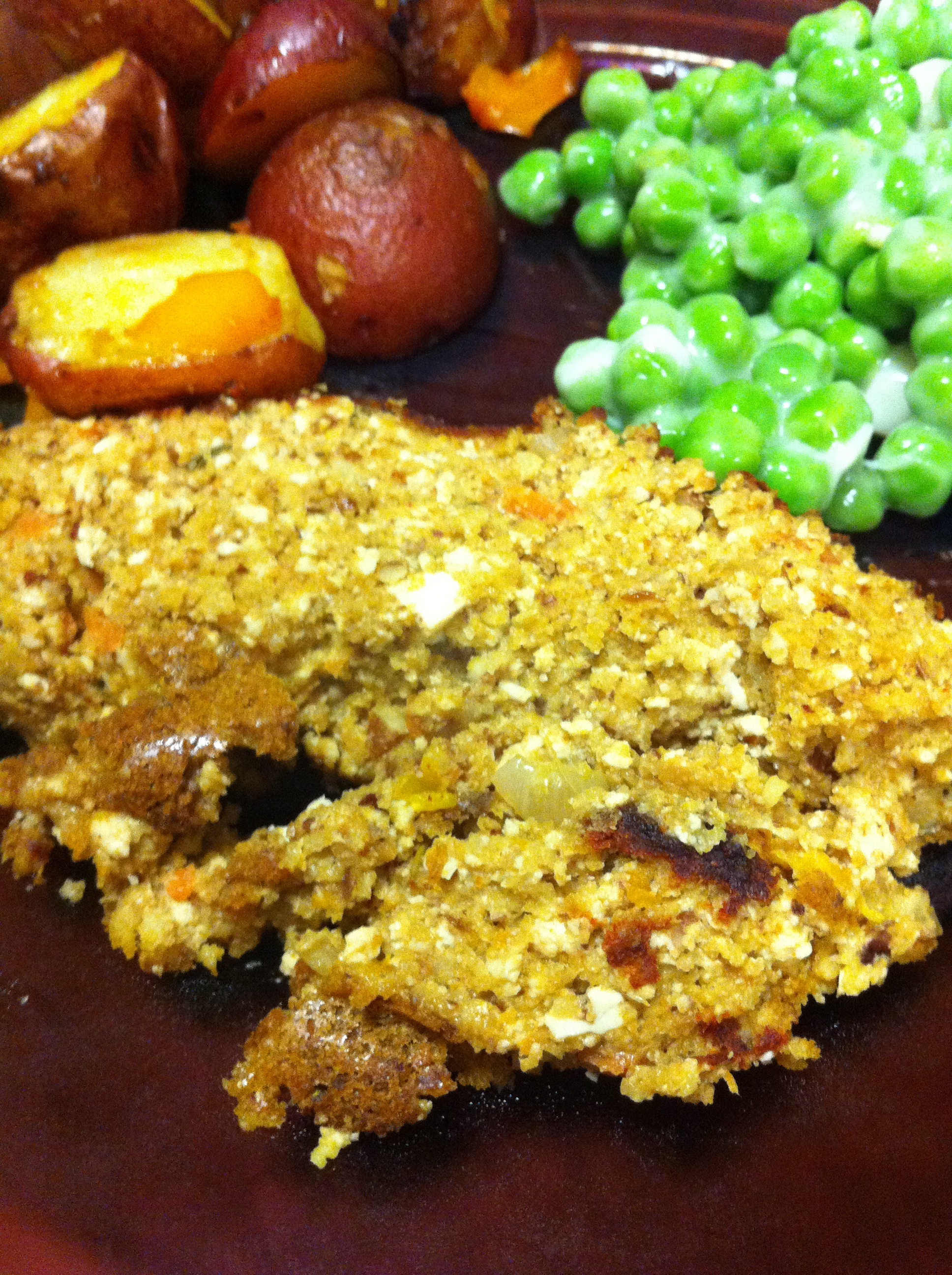 In an oven safe dish form your tofu mix into a loaf. Prepare the ingredients for the top by mixing together and spread over top. Bake for 34 – 40 minutes. I like my outside crispy. Enjoy.