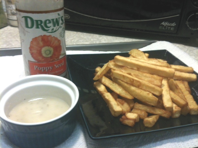 Once the deep fryer hit the required 350 degrees I dropped those strips of starchy goodness for 3 minutes. They were a nice golden brown when finished, crispy on the outside and fluffy on the inside. I served them hot with Drew’s Poppy Seed Dressing as a dip*. It was my first unqualified french fry win.