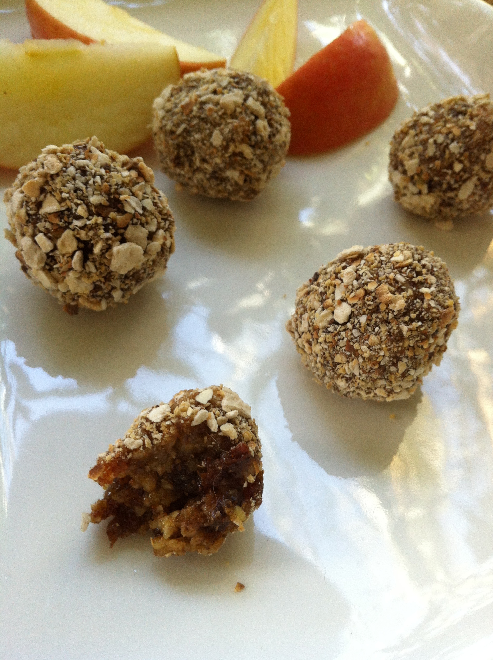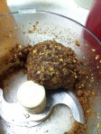 In a food processor or blender mix walnuts, dates, raisins, maple syrup, and pumpkin pie spice until it’s well blended into a ball. Place in fridge.