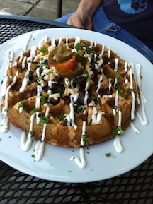 On our return trip we stopped by later in the day so we could try lunch and it lived up to the promise of our breakfast a week earlier. The Special that day was a Southwestern Style waffle made from corn meal covered with Black Beans, Salsa, Cilantro and the ingredients one usually finds in SW dishes. Once again the waffle itself was corn muffin-esque perfection and the toppings were stellar as well.