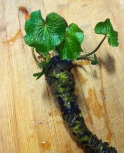 Yesterday when I was shopping at our local Asian market I found fresh wasabi and the root actually had the leaves on it. It cost a mere $70 a pound and the little piece I bought was $8. I planned on adding the leaves to one of the sushi rolls but I couldn’t bring myself to use them, though we did grate some of the root to try, and it has a great fresh flavor completely different from the wasabi powder we know. The root is now soaking in cold water until I figure out what to do with it. Any ideas?
