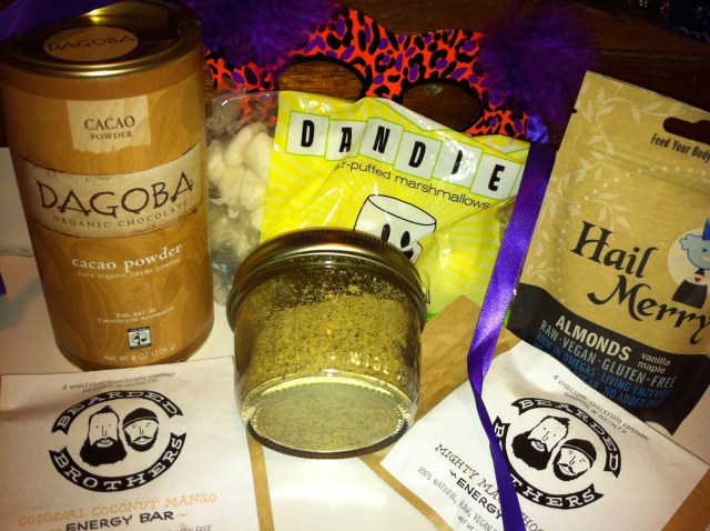 The most exciting thing for me is the fact that she sent homemade Hempesan by Choosing Raw. which I have yet to try but am looking forward to! I was also thrilled about getting more cacao powder. The snacks will also be awesome to add to our back pack for family outings, though I am headed to California next week and may have to eat them on my own. The little vegan was thrilled about the Dandies and the mask.