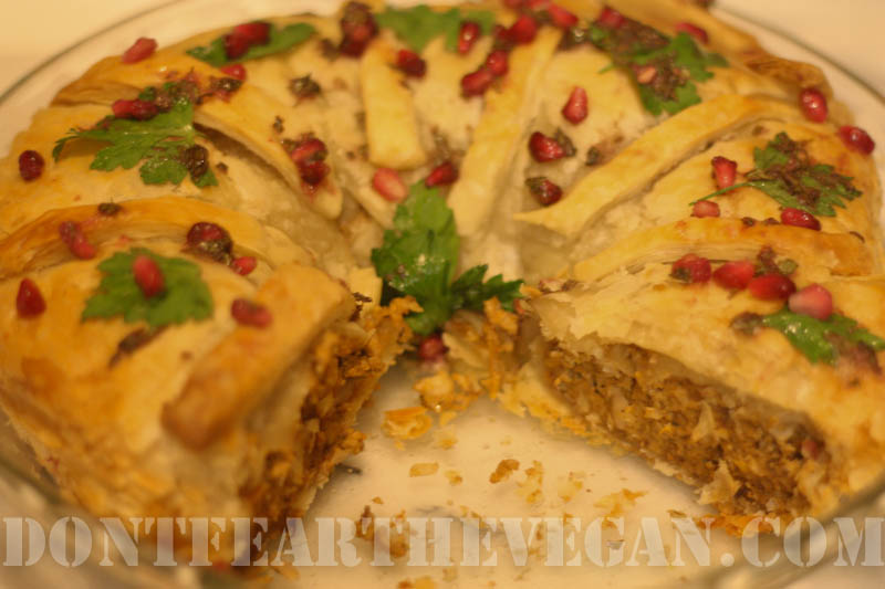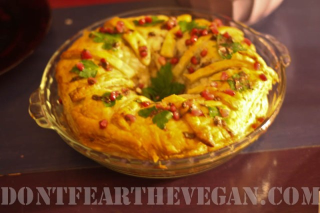 Bake. My puff pastry package said 20 minutes but this took 45 minutes to become golden brown. I would begin checking around 20 just to make sure. I have an old, crappy oven! Once golden brown remove and top with parsley leaves and Parsley Pomegranate Sauce (recipe below.) Serve.
