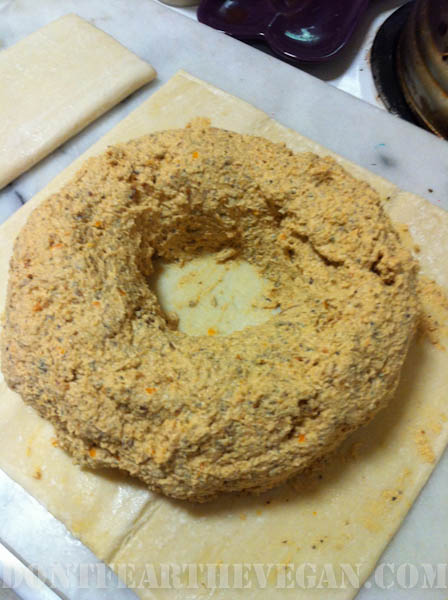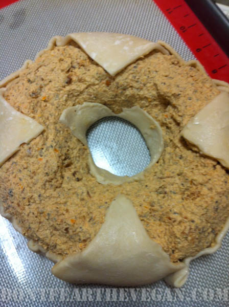 Place second sheet of puff pastry over top, molding around ring to match up with bottom sheet. Cut off excess and put aside. In center cut another “T” and mold around the center. Use extra pastry to cover any spots in the center that may have been missed. I also cut mine into strips to decorate the top.