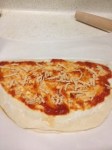 Prepare the dough according to the instructions (note, the dough instruction say it should sit out for 20 minutes before you kneed it so you might want to do that first). Transfer stretched dough onto a piece of parchment paper before adding toppings. Trust me, have the calzone on parchment paper makes transferring in & out of the oven much easier unless you have an oven paddle