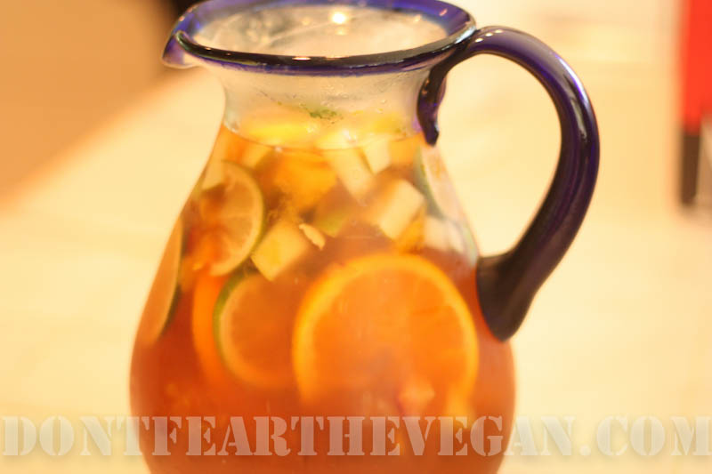 This past weekend we shot our first Don’t Fear the Vegan video. The details are still a secret, though I can say we had some awesome friends that volunteered to help in exchange for free food and drinks. I can also let you know that are theme was food found at Mexican Restaurants. Today I am going to share the Sangria recipe we used in the shoot.
