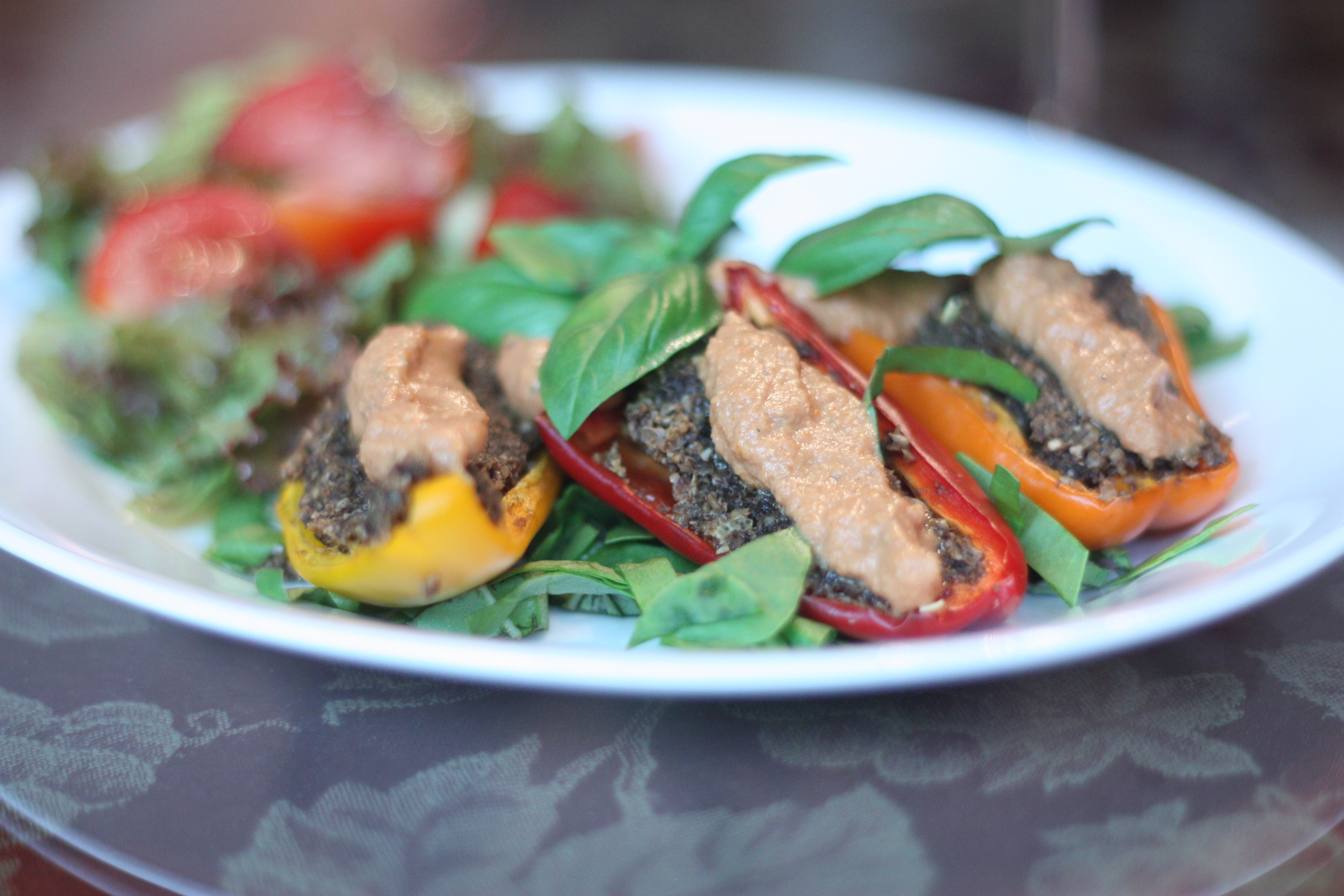 Put all remaining ingredients in food processor and blend until it is a pate. Scrap sides well so there are no whole nuts or seeds left. Fill each pepper and place on dehydrator sheets.