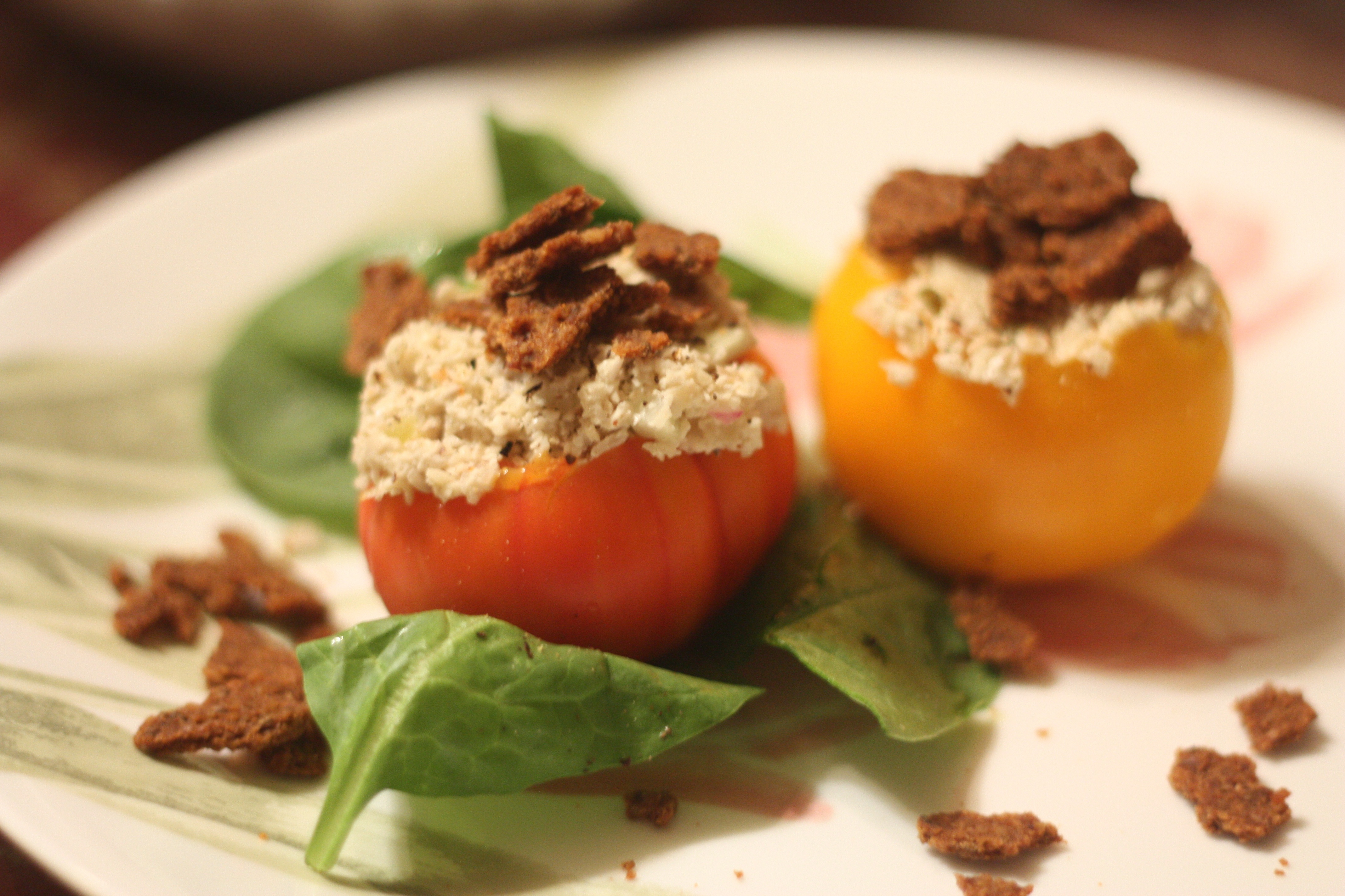 Still unpacking tonight so we took a family favorite and twisted it up a bit. No new recipe, but instead an old recipe presented in a new way. The Brazil Nut Tuna worked perfectly stuffed in the heirloom tomato. It made me think that if I wasn’t allergic to avocados, I would really like the tuna stuffed in one.