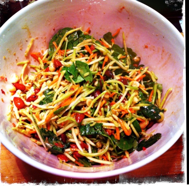 Today I am kinda going to call a cheat. I have a few perishable items I had to get rid of so I opted to make them into what they were bought for. This salad is a family favorite, well except for Anzia. It is a bit too spicy for her. This salad works great as a side dish and ages well.