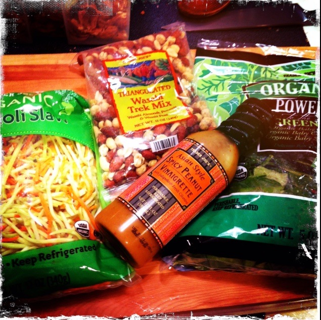 Open up broccoli slaw, trek mix, and vinaigrette. Pour everything into a large bowl. Mix together. Slowly add in Power to the Greens (I do a handful at a time and mix in, then repeat.) Let chill or eat immediately.