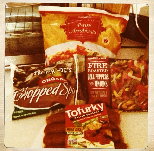 Saute sausages in olive oil for a couple of minutes. Add everything else and cook according to directions on the back of the Arrabbiata package. Serve.