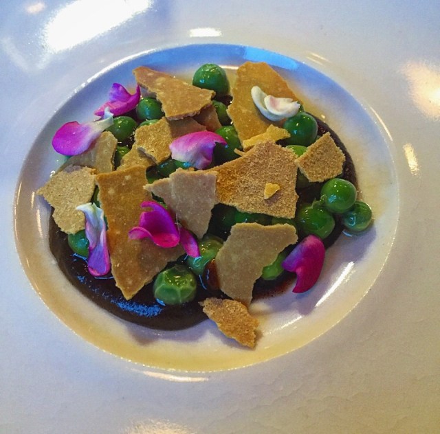 Savannah pole beans, summer savory, corn, mushroom sauce, black garlic meringue