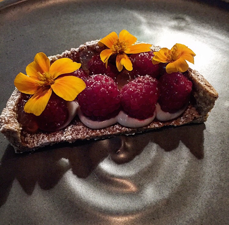 Raspberry hazelnut tart, apricot pit cream, marigold