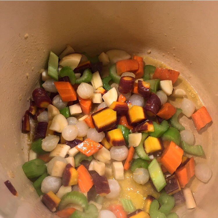 In a soup/stock pot (I used 8 qts) melt butter over medium heat. Add olive oil, salt, onions, carrots, celery, parsnip, and garlic. Cook stirring occasionally for 5 minute.